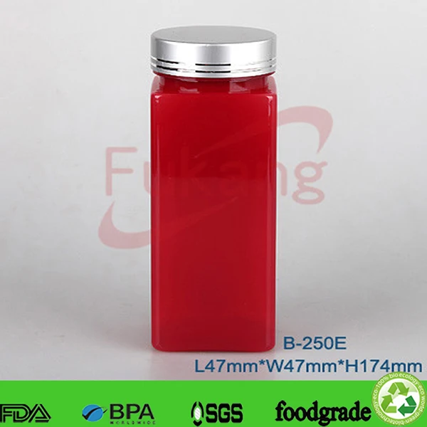 250cc PET塑料藥方瓶,紅色塑料維生素膠囊銀鋁蓋瓶
